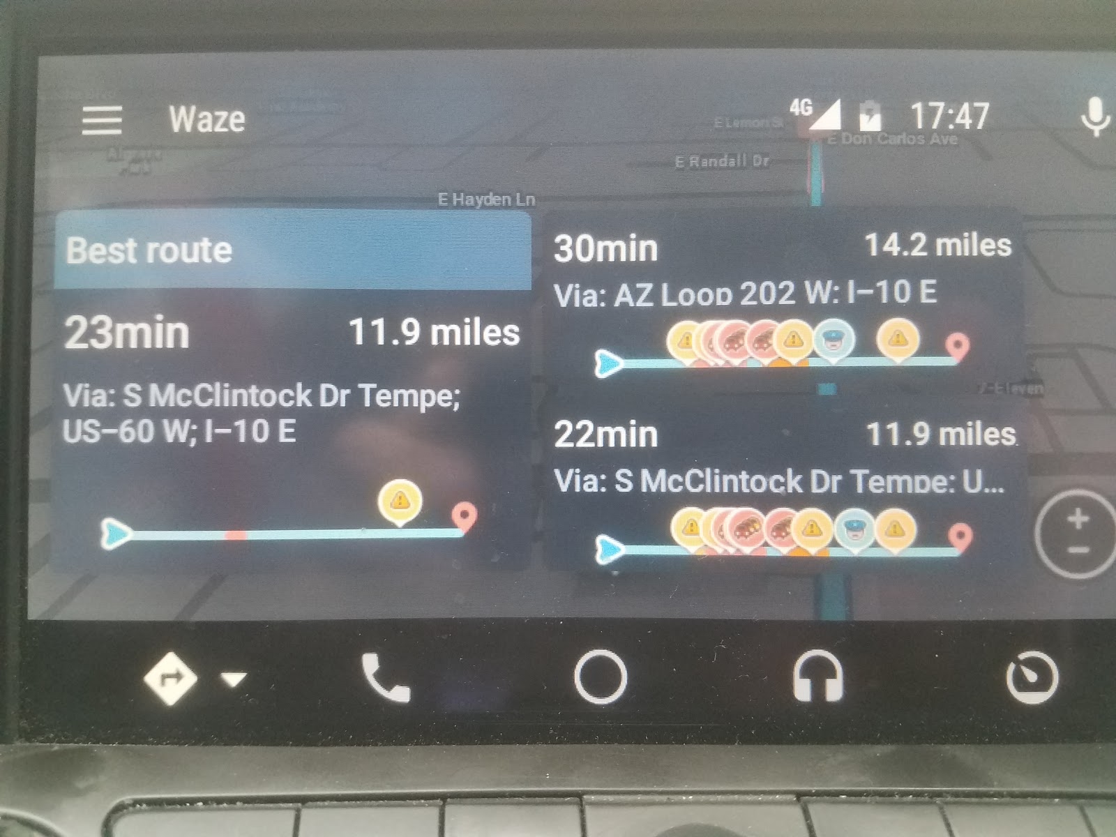 9/28/2018: I'm actively using Waze this week and maybe for a while so I can record my observations and report back. Today I noticed yet another deficiency in Waze WRT to GM. I also have 3 different ways (ha! Waze... vs ways... lol) to get to work and depending on traffic GM routes me to any of those 3 different routes. One thing that GM does is that it shows different routes on the map while under navigation. The current, optimal route it highlighted and color coded based on congestion. Alternate routes show up as grey and there's a little annotation on the alternate route. It says things like "5 minutes slower" or "Similar ETA". When headed to work it often directs me to take 143 then go over to 202 but the other common route is taking 60 E. If I'm getting to the turn off for 60 E off of I-10 and I see a little bit of a traffic jam ahead on I-10 heading towards 143 (sometimes there's a little bit of a delay before Google becomes aware of a backup in progress) and the 60 E gray highlighted route says "Similar ETA" I take 60 and avoid the congestion. I noticed using Waze today that it doesn't do any of that. There's no "5 minutes slower" or "Similar ETA". I'm not even sure there's any indication on the map of an alternate route as I find the color scheme that Waze has choice to be odd and harder to read at a glance.